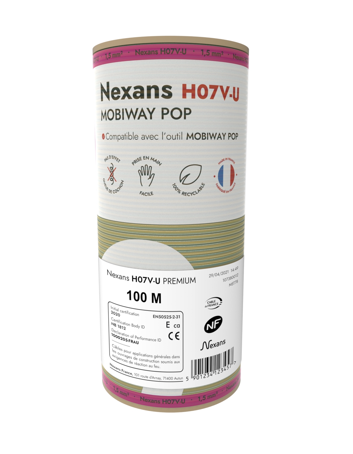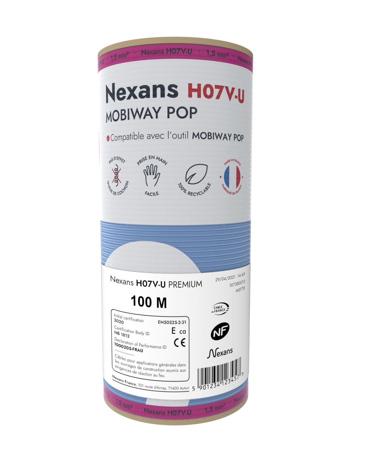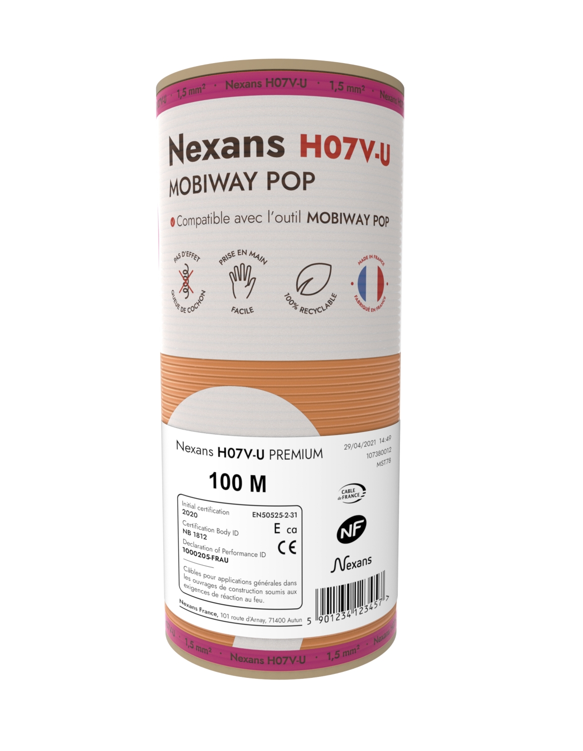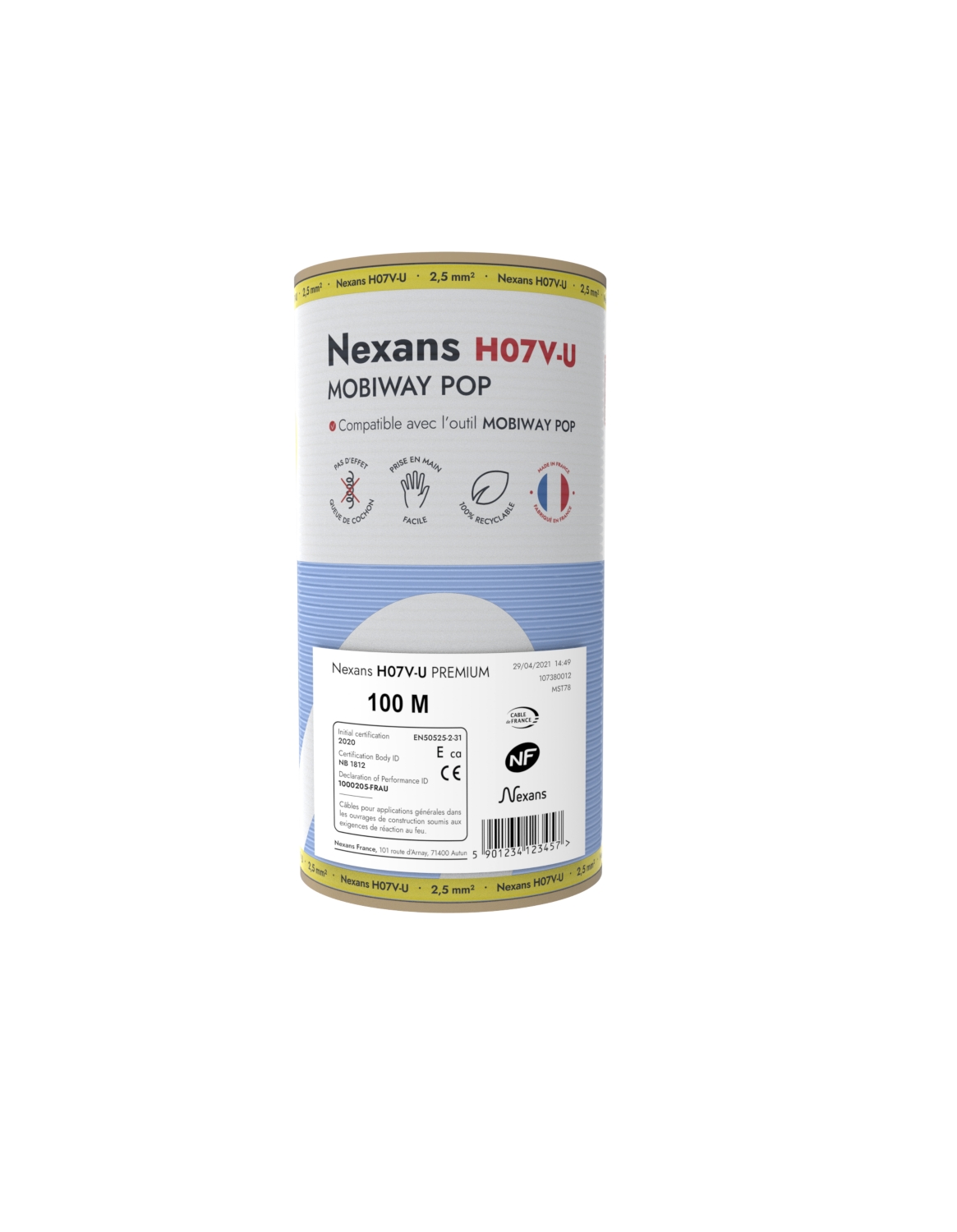 Les bobinots de fil Nexans H07V-U Mobiway Pop ont été conçus pour faciliter le travail des installateurs. Le format en bobine compacte réduit drastiquement l'effet spiral et facilite le tirage des fils VU. Cette innovation Nexans est unique et fait gagner en temps et en confort sur les chantier.