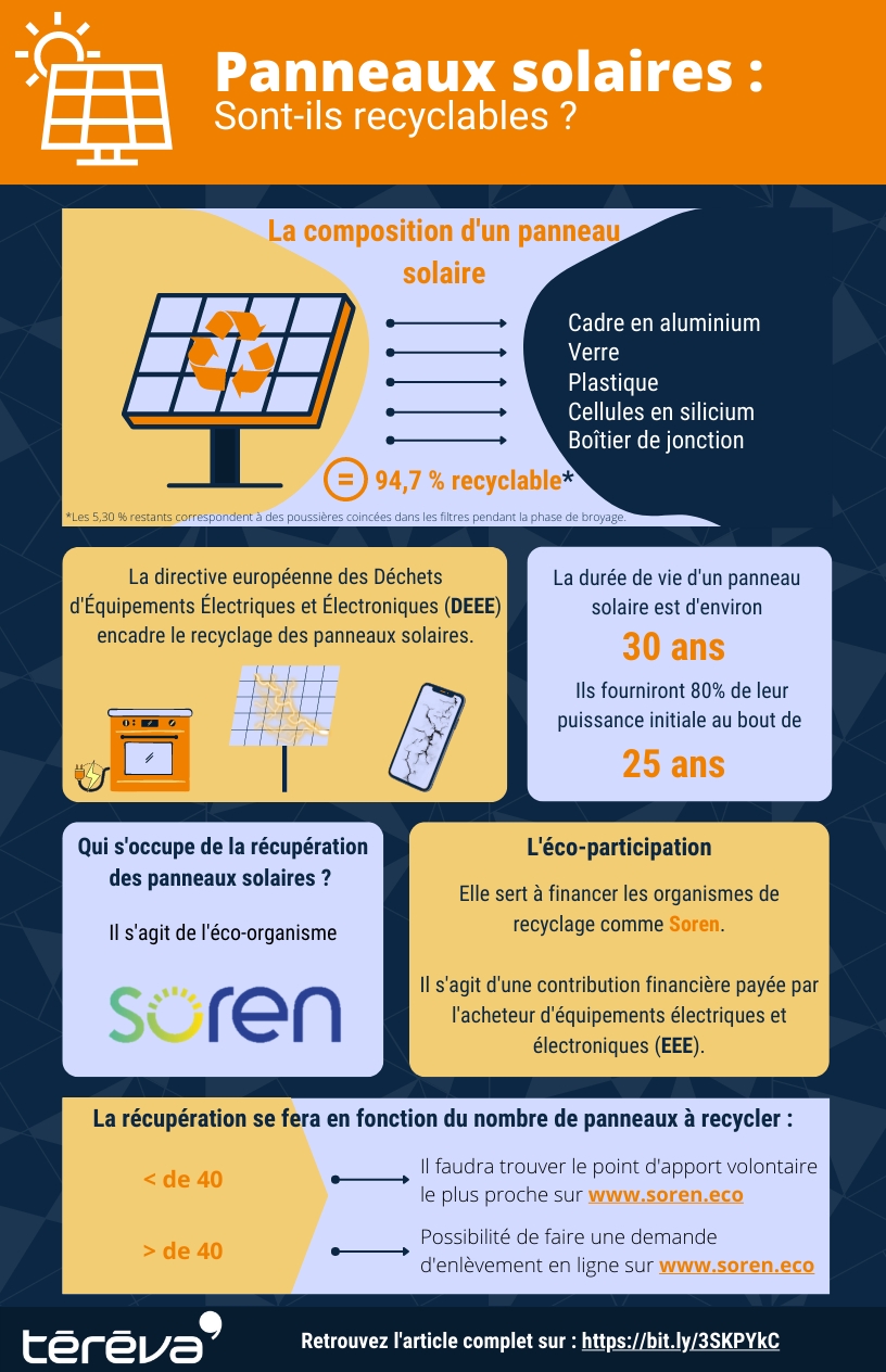 C’est la directive européenne DEEE (Déchets d'Équipements Électriques et Électroniques) qui encadre le recyclage des panneaux solaires.
