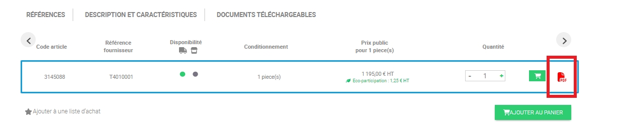 Rendez-vous sur la fiche produit de la référence pour laquelle vous souhaitez télécharger la DoP. Cliquez sur le logo PDF présent au bout de la ligne de la référence souhaitée.